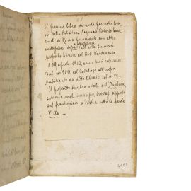In 8vo piccolo, incisione a piena pagina con Ercole seduto su un sasso e Fama come angelo che suona la tromba e tiene lo stemma dei Borghese, tavola ripiegata incisa con la facciata di Villa Borghese, iniziali e fregi decorati. Pergamena flessibile coeva (un po’ sciupata), assente la carta A1 bianca; timbro ripetuto della Biblioteca Nazionale Vittorio Emanuele (con giustificazione della vendita in fine), pallide arrossature, un po’ sciolto, ma buona copia. [SI AGGIUNGE:] BRIGENTIO, Andrea. Villa Burghesia vulgo Pinciana. Romae, apud Franciscum Gonzagam, 1716. In 8vo piccolo in cartonato flessibile coevo, vignetta xilografica al frontespizio e iniziali xilografiche, scompleto.
