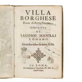 PRIMA EDIZIONE di questa opera interamente dedicata a Villa Borghese. Costruita per il cardinale Scipione Borghese (1577-1633) sul colle romano Pincio e circondata da ampi giardini, fu progettata per ospitare una delle migliori raccolte europee di dipinti, antichità e sculture. Il resoconto dettagliato di Manilli, scritto con il tono coinvolgente di una guida turistica, fornisce una panoramica inestimabile dell’architettura della Villa e dei suoi tesori. Sono descritti l’impianto e le sculture dei famosi giardini segreti che circondano la Villa, uno dei quali fu il primo parco di caccia a Roma, e poi l’architettura e le decorazioni scolpite e dipinte degli esterni e degli interni. Tra i capolavori delle venti sale, sono elencati dipinti di Caravaggio (es. Cristo alla colonna, Putto morso da un granchio), Tiziano (es. Venere con ninfe), Veronese (es. San Giovanni nel deserto) e Giulio Romano (es. Davide e Golia). Il racconto di Manilli svela con gusto le molteplici sorprese riservate al lettore. Di lui si sa molto poco, se non che fu custode di Villa Borghese e autore di questa antica e influente guida per i Grand Tourists, tradotta in latino nel C18.
