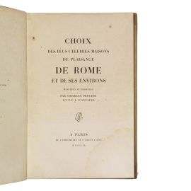 PRIMA EDIZIONE, completa delle belle tavole che illustrano planimetrie, vedute e piante dei giardini delle più celebri ville romane: Albani, Medici, Borghese, Farnesina, Madama, Altieri, Giustiani, Aldobrandini, Caprarola, ecc. Percier conobbe Fontaine a Roma, dove iniziarono una lunga collaborazione. Influenzati dall’architettura rinascimentale italiana, divennero i principali fautori del neoclassicismo.