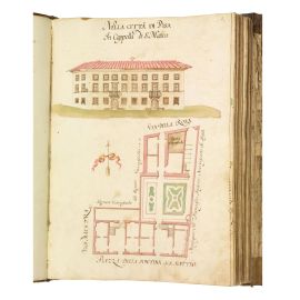 Manoscritto cartaceo in folio (441 x 310 mm) di [12] 291 carte più altre [7] carte bianche numerate 293-302 (per un totale di 620 pagine, scritte 294), contenente un grande stemma policromo dei Casanuova con veltro, torre e vascello, e 141 pagine con disegni originali a colori. La carta è forte e per lo più bianca, la grafia leggibile. Legatura a busta originale dell’epoca in pelle scura con chiusura in corda e fermaglio di metallo, interni in carta marmorizzata. Preservato in ulteriore custodia antica rivestita in tela grezza con lacci. Tracce d’uso e del tempo, ma nel complesso copia genuina molto ben conservata.