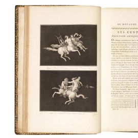 5 volumi in folio grande (495 x 324 mm). Vol. 1: [vi] xiii [iii] 252 pp. e [54] tavole calcografiche. Vol. 2: [iv] xxviii 283 [1] pp. e [84] tavole calcografiche. Assenti [9] pp. in fine corrispondenti ai fascicoli χ-2χ². Vol. 3: [iv] iv xl 130 [22] [131]-201 pp. e [63] tavole calcografiche. Vol. 4: [iv] xviii [4] 266 pp. e [72] tavole calcografiche. Vol. 5: [iv] iv [2] 268-429 [1] pp. e [35] carte calcografiche. Vignetta calcografica sul frontespizio disegnata da Jean Honoré Fragonard e incisa da Augustin de Saint-Aubin. Dedica calcografica alla regina. Testatine e finalini calcografici realizzati da vari disegnatori ed incisori. Vitellino marezzato coevo un po’ sciupato (mancanza ad un angolo inferiore del primo volume, abrasioni e sbucciature). -- Carte occasionalmente ingiallite o brunite in modo pallido, saltuarie fioriture e macchie, volume 3 con sottile e pallida gora al margine superiore e altre tracce del tempo.
