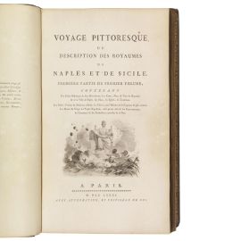 UNO DEI PIÙ CELEBRI ILLUSTRATI DEL SETTECENTO. PRIMA EDIZONE, illustrata da 308 tavole calcografiche inclusa quella del Phallus talora assente, in legatura coeva. Jean-Claude Richard de Saint-Non, meglio noto come Abate di Saint-Non, o Abbé de Saint-Non (1727- 1791), è stato un incisore, disegnatore, umanista, nonché archeologo, mecenate e viaggiatore francese. Tra il 1759 e il 1761 visitò l'Inghilterra e successivamente l’Italia, dove strinse amicizia con il pittore Jean-Honoré Fragonard e Hubert Robert, di cui divenne il mecenate. Viaggiò con loro in Sicilia e a Napoli e, al suo ritorno, iniziò a pubblicare il Voyage Pittoresque, adornandolo da oltre cinquecento tavole e vignette incise dai migliori artisti dell’epoca (tra cui Charles-Nicolas Cochin, Pierre-Philippe Choffard, Heinrich Guttenberg, Joseph de Longueil) a partire dai propri disegni, da quelli di Clément-Pierre Marillier e di Claude-Louis Châtelet, (valente pittore a cui Maria Antonietta era particolarmente affezionata), e dai disegni dei suoi compagni di viaggio. Una tale pubblicazione, rivolta solo a un numero molto ristretto di facoltosi collezionisti, era al di là delle forze di un privato. L’impresa si rivelò rovinosa per Saint-Non, assorbendo non solo la sua fortuna, ma anche quella della sua famiglia. Portò comunque a termine il suo compito, conservando come risorsa solo il reddito della sua abbazia, conscio dell’importanza che un’opera del genere avrebbe rivestito nei secoli successivi sia per gli studiosi, sia per i bibliofili.
