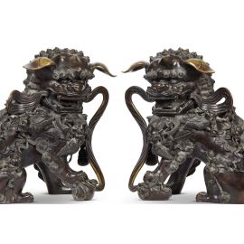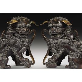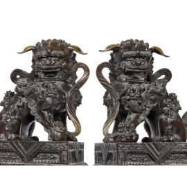 Le statue dei leoni guardiani si sono tradizionalmente poste di fronte ai palazzi degli imperatori cinesi ed alle loro tombe, ai templi ed ai palazzi degli alti ufficiali o nobili quale potente simbolo apotropaico. Come un ornamento tipico della tradizione cinese. Si tratta di uno stilema decorativo nato nell'ambiente del buddhismo cinese con intento apotropaico. I leoni sono rappresentati in una coppia che dovrebbe consistere di un maschio con una sfera intagliata tra gli artigli (a simboleggiare il dominio dell'imperatore sul globo terracqueo) e una femmina che trattiene un cucciolo giocoso supino sotto di lei (a simboleggiare il nutrimento). Come manifestazione di Yin (negativo) e Yang( positivo): la leonessa per lo Yin ed il maschio per lo Yang. Il maschio ha la zampa anteriore destra su di una sfera apparentemente di stoffa, chiamata "palla ricamata" ( 绣球 ). La femmina è essenzialmente identica ma ha un cucciolo sotto la zampa sinistra a rappresentare il ciclo della vita. Simbolicamente, la leonessa protegge gli abitanti (l'anima vivente interna) e il maschio protegge la struttura (gli elementi materiali esterni) dell'edificio che entrambi sorvegliano. La coppia di leoni presentata in asta è fusa in bronzo con basi decorate a incisione e poggianti su piedi a forma di nuvole Ruyi. A causa dell'elevato costo di questi materiali e del lavoro richiesto per produrli, l'uso dei leoni custodi era probabilmente riservato alla famiglia imperiale, come simbolo di ricchezza e potenza, e non solo. In questo caso, degni di nota si presentano sedici cuccioli sui corpi della coppia: quattordici sulle spalle e due vicino alle zampe. A differenza della più nota rappresentazione dei leoni bronzei come feroci, questa coppia è caratterizzata da un’immagine che esalta la dimensione famigliare e affettiva. Le orecchie non sono rivolte verso l'alto, ma si abbassano docilmente, forse allusione alla discrezione nell’ascolto e al non interferire negli affari di corte. Si ravvisano protuberanze ossee sulle teste, campanelli ai colli, keyūra (璎珞) sul petto, svolazzi nelle bocche aperte. Le belle criniere, di rara e mirabile resa, coprono le parti posteriori della testa, il petto e i lati delle zampe. Gli artigli sono robusti, ma non pronti all’attacco. Probabilmente destinata all’Harem imperiale, questa coppia di leoni potrebbe ascriversi alla Cina della dinastia Qing, in virtù della tecnica artigianale di fusione e di incisione del bronzo.