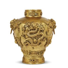 in bronzo dorato decorato con draghi nuvole e fiori a rilievo, prese sulle spalle a forma di testa di drago.