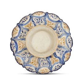 in maiolica, dipinta in policromia con giallo, giallo arancio, blu di cobalto e bruno di manganese; diam. cm 25,2, diam. piede cm 12,8, alt. cm 7