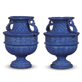 in terracotta invetriata color azzurro ceruleo. All’interno del collo di entrambi i vasi numero di collezione D475 in rosso; alt. cm 30,5, diam. bocca cm 16, diam. piede cm 13