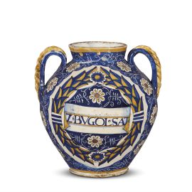 Entrambe le facce del vaso presentano una grande ghirlanda fogliata delineata su fondo a risparmio, centrata in alto e alla base da un fiore multipetalo e trattenuta ai lati da nastri, a racchiudere l’iscrizione apotecaria Z.BVGOLOSA, redatta in blu cobalto in lettere capitali. La superficie restante è interessata da un motivo a “fondale blu graffito”, con racemi vegetali ottenuti a graffito su fondo blu cobalto, che terminano in fiori realizzati a risparmio nei petali delineati in blu e poi riempiti di giallo, e centrati da un circolo rosso.