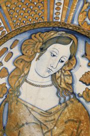 Questo esemplare si inserisce a pieno in quel gruppo di piatti con figure femminili, ispirate probabilmente dai dipinti del Pinturicchio, databile grazie al confronto con il noto piatto del British Museum recante lo stemma di papa Giulio II, che colloca l’intera serie come compresa negli anni del suo pontificato, durato dal 1503 fino al 1513, e pertanto al primo trentennio del XVI secolo.