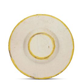 in maiolica dipinta in policromia con verde rame, verde oliva, giallo, giallo arancio, blu di cobalto, bruno di manganese nella tonalità del nero e del marrone, bianco di stagno; diam. cm 29, diam. piede cm 11, alt. cm 2,9