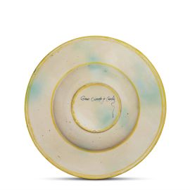 in maiolica dipinta in policromia con bruno di manganese, verde ramina, blu di cobalto, giallo e giallo arancio. Sul retro in caratteri corsivi dipinti in blu di cobalto l'iscrizione Giove Converso in Cavallo; diam. cm 26,6, diam. piede cm 9, alt. cm 4,5