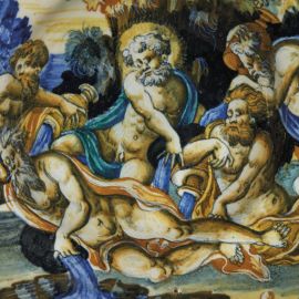 I modi sono quelli di un pittore attivo nella bottega di Guido da Merlino studiato da Carola Fiocco e Gabriella Gherardi, che hanno raccolto attorno a questa figura anonima una serie di piatti. Il pittore, che già era stato definito come Pittore di Sansone e i Filistei da una coppa del Louvre, è per le due studiose l’autore di un piatto ora al Museo di Sèvres dietro al quale compare un’iscrizione che ne attesta la produzione nella bottega di Guido di Merlino il 30 marzo del 1542. Si tratta di una delle botteghe più importanti di Urbino, nella quale hanno lavorato alcuni pittori tra i quali Luca di Bartolomeo da Casteldurante, Fedele di Giovanni e Francesco Durantino. I piatti e le coppe, alcune lumeggiate a lustro, sono elencate in dettaglio nella scheda che accompagna un esemplare molto prossimo al nostro per stile figurativo, ma anche per la distribuzione della scena su più piani: si tratta di un opera con scena allegorica della collezione Gillet al Museo di Lione, alla cui scheda rimandiamo per confronto e analisi critica. Alle opere elencate con attenzione dalle studiose si può aggiungere a nostro parere il piatto oggetto di studio unitamente a un piatto, lumeggiato in lustro rosso, ora alla Pinacoteca di Varallo nella collezione Francesco Franchi.