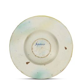 in maiolica dipinta in blu di cobalto, verde, giallo, giallo arancio, bruno di manganese, bianco di stagno. Al verso la scritta in blu cobalto con caratteri corsivi Aquariio; diam. cm 24,2, diam. piede cm 7, alt. cm 4