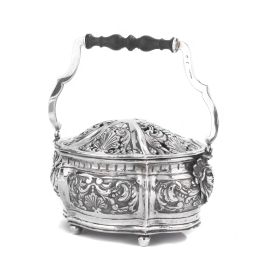 in argento di forma ovale sagomata, quattro piedini a sfera, corpo decorato da volute e foglie a rilievo, coperchio traforato, manico con presa centrale in legno tornito e unito al corpo da mascheroni, cm 24x21x27, g 1225