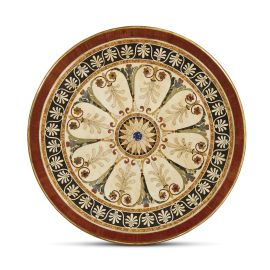 con piani circolari intarsiati in marmi colorati e supporto ligneo lumeggiato in oro su gambe a colonna scanalata riunite da traversa a crociera traforata con elemento centrale in foggia di vaso; cm 81,5x83