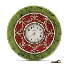 in nefrite, smalto rosso e fascia in oro e metallo dorato; il quadrante con numeri arabi recante firma Fabergé e contornato da diamanti a rosette; reca bolli spuri dell’orafo Henrik Wigström (1862-1923); completo di astuccio; diam. cm 13