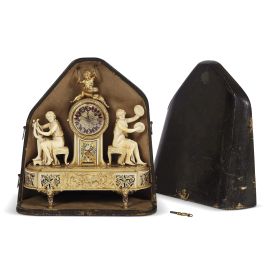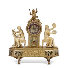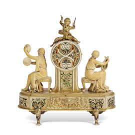 in ottone, smalti e osso. Presenta cassa centrale con quadrante circolare, con numeri romani per le ore e sportellino in vetro apribile. Sormontato da putto con percussione e cornamuse, affiancato dalle allegorie della musica e della poesia. Poggia su base lignea sagomata con decorazione di putti e capre lavorate a sbalzo e poggiante su quattro piedi con teste leonine. Fregi intramezzati da motivi floreali policromi che si ripetono su tutta la struttura dell’orologio; completa di chiave e astuccio originale; cm 19x17,5x8,2