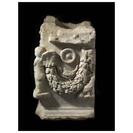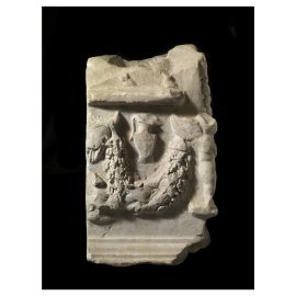 Festoni, patera e urceus sono espliciti rimandi all’uso reale d’incoronare i monumenti funerari durante le cerimonie religiose con encarpi di fiori e frutti e i richiami simbolici della decorazione sono una chiara evocazione dell’idea di una vita oltre la morte.