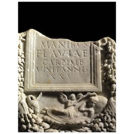 Una nicchia, oggi scoperchiata, è ricavata nel marmo al fine di ospitarvi i resti combusti della defunta Flavia Carpime morta all’età di 25 anni.