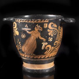 Skyphos sovradimensionato rispetto al tradizionale modello corinzio. Orlo arrotondato leggermente svasato e corpo troncoconico rastremato in direzione del piede conico a disco; anse orizzontali a bastoncello impostate sopra il punto di massima espansione del vaso. Decorazione figurata lato A: figura femminile vestita di unlungo chitone fermato alle spalle e alla vita e con capelli raccolti nel sakkos, adorna di dettagli anche preziosi, tiene un grappolo d’uva nella mano sinistra e una phiale nella destra. Decorazione figurata lato B: figura virile di un giovane nudo (con mantello sul braccio sinistro), ma adorno a sua volta di un dettaglio prezioso tra i capelli riccioluti, impugna un tirso con la sinistra e regge una phiale con la mano destra. Sotto le anse, palmetta a ventaglio aperto tra girali.