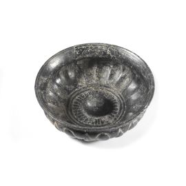 Orlo svasato, ampia vasca decorata da bacellature alternate a rilievo e fondo piano con rilevato ombelico centrale. La decorazione consiste in motivi ad incisione sull'orlo e solcature in corrispondenza del fondo e dell'ombelico. All'interno della vasca, intorno all'ombelico, è posta una fila di linguette radiali.