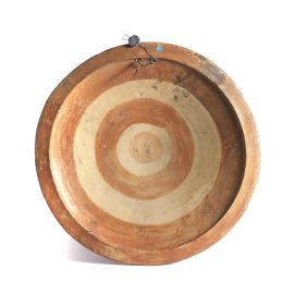 Orlo a tesa, vasca poco profonda e piccolo piede a disco. Il piatto appare decorato sia internamente, sia esternamente con una vernice dai toni che vanno dal rosso all'arancione; l'interno presenta un motivo decorativo a fasce concentriche, mentre all'esterno si osservano motivi lineari che inquadrano una banda a risparmio con la rappresentazione di cinque aironi stilizzati. I due piccoli fori visibili lungo il bordo del piatto, in alto, testimoniano l'uso di appenderlo alla parete della casa o della tomba.
