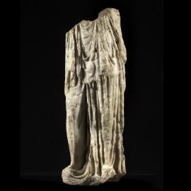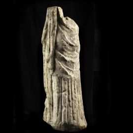 La statua di maggiori dimensioni, a due terzi del vero, conserva la parte inferiore del tronco e le gambe di una figura femminile stante, con la destra piegata e scartata di lato; il peplo che veste la figura, per nulla schematico nella resa delle pieghe irregolari del panneggio, ne sottolinea ed esalta le forme sinuose, risultando particolarmente aderente sul retro. Potrebbe trattarsi di una rappresentazione della dea Artemide, soprattutto in virtù della presenza di un foro all'altezza della coscia sinistra, possibile alloggiamento dell'arco.