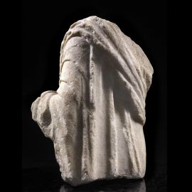 La figura femminile panneggiata indossa un chitone morbido fermato al di sotto del seno da una cintura tubolare annodata sul davanti; sulle spalle è appoggiato un ampio himation che arrotolandosi all’altezza della vita nella veduta frontale del torso, ricade infine sul braccio sinistro proteso. Il torso è dotato di base in marmo peperino.