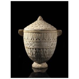 La superficie dell'urna appare decorata con motivi fitomorfi a rilievo sia sul corpo ovoide, dotato di anse laterali e piede ad anello, sia sul coperchio con presa a forma di pigna. Tale decorazione risulta interrotta sul corpo dell'urna, a metà circa della sua altezza, da una fascia con motivo a intreccio al centro della quale è un cartiglio con iscrizione.