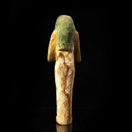 L'ushabti era considerato dagli antichi Egizi come una sorta di servitore magico con il compito di accompagnare il defunto nei campi di Ialu per lavorare al suo posto. La figura, mummiforme, a braccia incrociate sul petto, perciò reca due arnesi agricoli (zappe) nelle mani e una cesta di sementi sopra le spalle; presenta inoltre parrucca tripartita dipinta di verde, volto di colore blu e numerosi dettagli su fondo giallo. Nella parte inferiore del corpo e sui piedi corre una colonna verticale con il testo in geroglifico. L'oggetto è accompagnato da un foglietto con un breve testo in inglese vergato a mano; una sorta di didascalia dell'oggetto: "Father gave me - Luxor - March 1889".