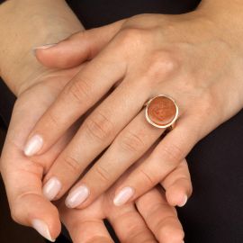 in oro a basso titolo, recante sulla sommità una corniola (difetti) raffigurante una donna con mazzo di fiori incisa, mis. 63, gr. 5