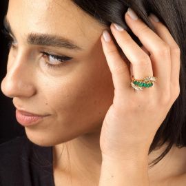 in oro giallo 18kt, realizzato seguendo un motivo a intreccio impreziosito da una fila di smeraldi taglio navette per ct 1 circa e diamanti taglio baguette per ct 1.30 circa, punzone 750, mis. 55, gr. 8