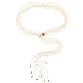 composta da otto fili di perle di mm 3 circa, fermatura in oro giallo 18kt e rubini taglio rotondo per ct 1 circa, lungh. cm 67, gr. 67