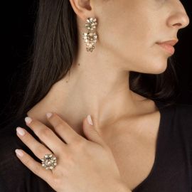 in oro 9kt, composta da paio di orecchini pendenti e anello impreziositi da perle di fiume, dim. cm 2x4,5, chiusura a vite, gr. 21 complessivi