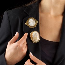 in metallo dorato, recanti al centro cammei in conchiglia raffiguranti i profili di due volti maschili incisi, dim. cm 5,5x5 e 4x5, gr. 33 complessivi