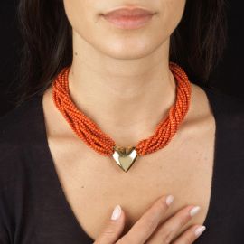 composto da tredici fili di sfere in corallo di mm 3 circa, fermatura in oro giallo 18kt a forma di cuore con iniziali incise, lungh. cm 44, gr. 111
