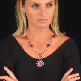 in oro giallo e bianco 18kt, catena composta da maglie concatenate di varie forme e distanziali in lapislazzuli e corallo, da cui pende un ciondolo a forma di fiore stilizzato impreziosito da intarsi in corallo, lapislazzuli e diamanti taglio brillante per ct 0.80 circa, dim. pendente cm 4x5, lungh. cm 50, gr. 115