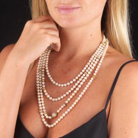 composta da un filo di perle leggermente digradanti di mm 8-5 circa, fermatura e distanziali in oro giallo 18kt impreziositi da diamanti taglio huit huit e brillante per ct 9 circa, punzoni 750 e del fabbricante, lungh. cm 244, gr. 155