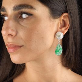 in oro bianco 18kt, composti da elementi a forma di fiore da cui pendono parti in giada incisa, impreziositi da diamanti taglio huit huit e brillante, punzone 750, lungh. cm 5, chiusura a cliup con perno, gr. 17 complessivi