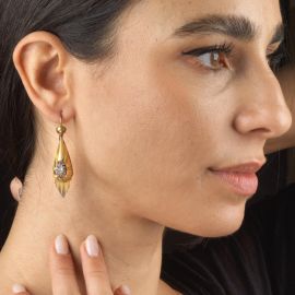 in oro a basso titolo, composti da elementi a goccia con frange pendenti, raffiguranti al centro un motivo stellato decorato in smalto con due diamanti taglio vecchio, lungh. cm 1x4,5, gr. 6 complessivi
