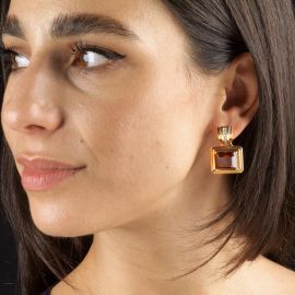 in oro giallo e bianco 18kt, impreziositi da diamanti taglio brillante per ct 0.10 circa e due quarzi taglio ottagonale, dim. cm 2x3,5, gr. 23 complessivi