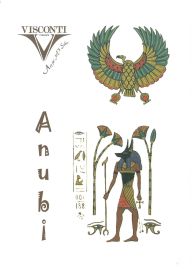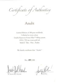La stilografica dedicata a Anubi rappresenta il dio egiziano della morte in tutta la sua eleganza e maestosità, dalle sembianze di uno sciacallo, sormontato, sul cappuccio dall'immagine di un'aquila e un serpente simboli connessi alla divinità.