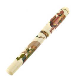 fusto in celluloide di color avorio finemente decorata a mano con tecnica urushi e maki-e in lacca e pigmenti policromi e dorati, raffigurante Ogres danzanti tra il fusto ed il cappuccio, pennino in oro 18kt misura M, caricamento a stantuffo double reservoir, lungh. cm 14,5. Corredata di scatola, controscatola, libretto e garanzia.
