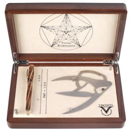 The Visconti Divina Proporzione pen is inspired by the Gold section. The Golden Number, in fact, represents the ratio between the length of the cap and the length of the pen, exemplified by the number 1.618 (phi) that returns in the issue of the print run of the fountain pen. The Golden Spiral or Nautilus, built according to the Fibonacci sequence, wraps the pen without ever stopping. Visconti supplies the writing instrument with a gold comparator, as well as an instrument capable of revealing the "Divine Proportion".