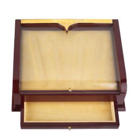 in legno laccato di colore bordeaux, ad un piano foderato in tessuto beige, corredata di un cassetto foderato in tessuto beige,