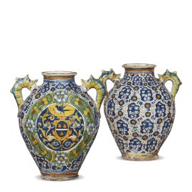 Gli orcioli appartengono a un contesto farmaceutico nobiliare laico e trovano puntuale riscontro in orcioli simili prodotti con successo duraturo dalle botteghe di Montelupo. I due contenitori, pur nell’alternanza tra alcuni dei principali ornati della manifattura di Montelupo e forme coerenti, ma con varianti morfologiche, trovano riscontro in particolare nella decorazione del medaglione centrale in vasi apotecari prodotti per le principali spezierie toscane. Ad esempio la variante nella forma delle anse è coerente con alcuni orcioli della farmacia del convento di San Marco a Firenze, con medaglioni con ritratti di Santi. Ma la maggiore vicinanza nel progetto dell’impianto decorativo si riscontra invece nell’orcio, già della collezione Pringsheim, prodotto per una farmacia laica e pubblicato da Carmen Ravanelli Guidotti, unitamente a due esemplari molto simili recentemente transitati sul mercato londinese (Sotheby’s, From Earth to Fire, Londra 1 novembre 2018, lotto 622), che condividono con il nostro il decoro a “palmetta persiana”, ma anche la presenza di grottesche con figure mostruose barbate, lì a circondare l’emblema della famiglia Stepazola di Verona. Tutti questi confronti sono databili tra il 1545 e il 1580 circa, arco temporale che riteniamo conforme per la coppia qui presentata.