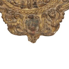 in legno intagliato e dorato di forma circolare, il centro incorniciato da battuta con motivo intrecciato e bulinato, che si porta su larga fascia riccamente intagliata con frutta, grande fiore centrale e nastro inferiore, chiusa a sua volta da fascia scolpita a motivo di squame con gola ritorta verso cimasa a doppia voluta in grande elemento sagomato a cartouche intagliato a motivi di girali fermati da nastrini terminanti in basso da cherubini addorsati con al centro stemma nobiliare (non identificato) dipinto in policromia; cm 57x40