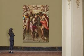 Raffaello Borghini nel Il Riposo, principale fonte di informazioni sull'attività di Francesco Morandini detto il Poppi entro il 1584, citava un Battesimo di Cristo in via di esecuzione da parte del pittore nativo di Poppi per Braccio de' Ricasoli: il dipinto, reputato perduto da Paola Barocchi in un articolo apparso negli anni sessanta, è stato successivamente identificato da Alessandra Giovannetti, nella monografia del 1995 dedicata a tale artista, con l'importante tavola qui offerta, essendo l'unica conosciuta con tale soggetto. Secondo la studiosa i caratteri stilistici sono pertinenti a quelle di altre opere realizzate intorno al 1584 dal Morandini, anno della pubblicazione del Riposo e pertanto termine entro cui presumibilmente il Borghini vide il Battesimo.
