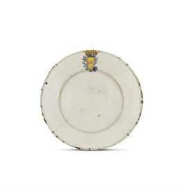 Lo stemma è raffigurato sormontato dalla corona marchionale e attorniato da roccaile e elementi fitoformi che fanno presagire influenze del Barocco, portandoci a pensare a una produzione già seicentesca. E se la difficile identificazione della manifattura merita un approfondimento, benché la qualità dello smalto porti ad ipotizzare una produzione romana o comunque dell’Italia Centrale, l’incertezza attributiva nulla toglie alla grande qualità di questo insieme di piatti, che costituiscono comunque un riscontro storico e sociale circa il modo in cui l’importante casata fiorentina abbia mantenuto nel corso del tempo il gusto della credenza armoriale nell’accezione più sobria del tardo compendiario.