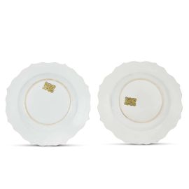 I due piatti, di porcellana bianca sottile, dura e sonora, dal bordo mistilineo sagomato a riprodurre la punta dei petali del fiore di loto (he), simbolo di purezza, mostrano al centro un decoro a smalti opachi raffigurante alcuni elementi tipici della simbologia cinese: il tavolino che sorregge rami di peonia (affetto, amore, bellezza) unito a una roccia Taihu e al fungo Ling-Zhi, segno taoista di prontezza spirituale o dell’anima, in una cornice a riserve campite con sottili ornati color caffè. In questi due esemplari sono eseguiti alcuni dei decori più delicati della famiglia rosa, qui con smalti acquarellati che ricordano alcuni dei reperti più raffinati giunti in occidente. La forma del piatto è ancora legata al gusto naturalistico che permane dalla cultura Ming e si manifesterà poi in alcune teiere o tazze di forma quasi scultorea, molto apprezzate sul mercato occidentale.