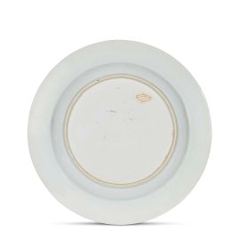 Il grande piatto ha cavetto poco profondo e largo, tesa piana e orlo liscio, e poggia su un piede ad anello. La porcellana bianca e sottile mostra sul fronte un decoro a smalti opachi, fencai, rilevabili al tatto, con un motivo principale con un giardino delimitato da uno steccato e centrato da una roccia taihu su cui sono posate due cicogne; un ramo fiori si staglia sul cielo arricchito da fiori di peonia e crisantemo. Il cavetto è delimitato da un motivo a punta di lancia in rosso secondo stilemi derivati da Meissen, mentre sulla tesa quattro rami fioriti a fiori di peonia in due toni di colore con dettagli definiti in bianco, secondo uno stile ancora legato al gusto decorativo cinese di cui conserva tutte le caratteristiche tecniche e simboliche. Lo stile pittorico riflette gli sviluppi innovativi degli artigiani attivi durante il regno dell'imperatore Yongzheng e si avvicina al cosiddetto "bondless style" per il design praticamente scheletrico e senza contorni, dove le uniche linee incorporate nella composizione sono quelle nere utilizzate per definire le nervature sulle foglie. Sebbene già nota nel periodo Ming, questa tecnica non era ampiamente utilizzata perché molto complessa e riservata a pittori particolarmente abili, capaci di non lasciare l’impressione di un lavoro incompiuto.